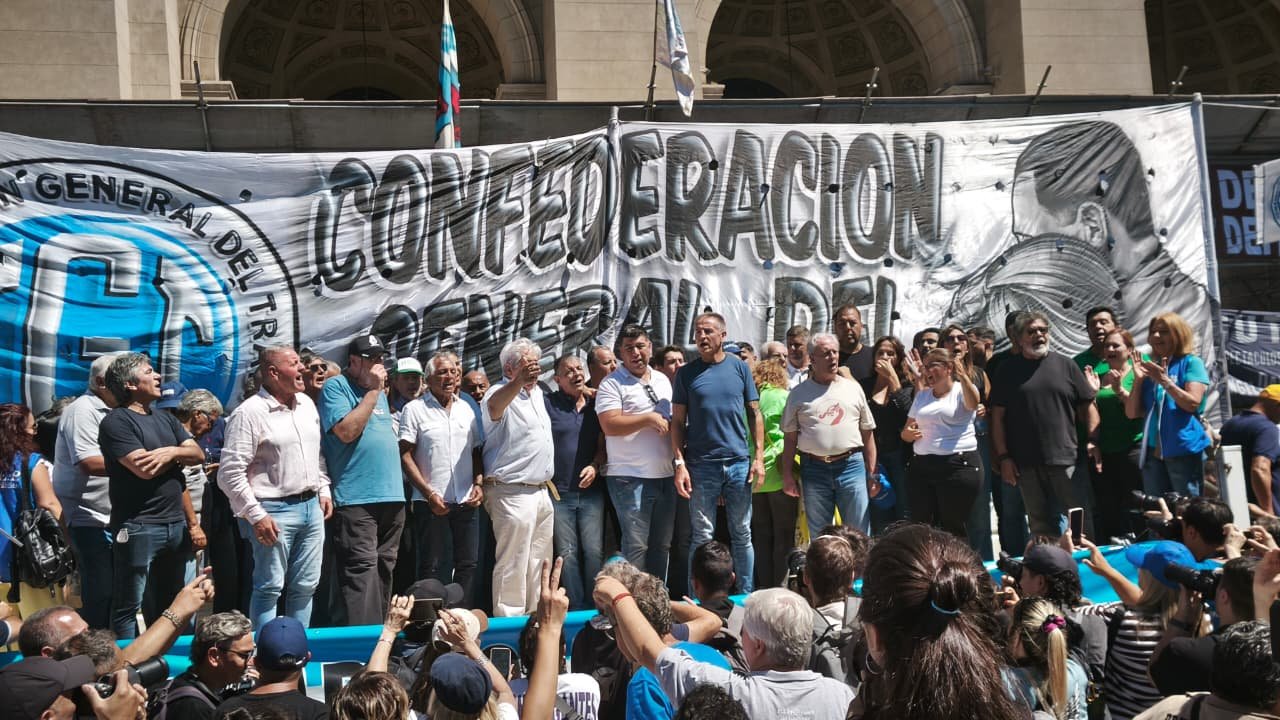 ¿El acto? Corto, breve, con la lectura de un documento a dos voces en un escenario improvisado sobre Talcahuano a metros de Lavalle. No hubo discursos de los presentes entre quienes estuvieron los integrantes del triunvirato de conducción: Jorge Sola, Cristian Jerónimo y Octavio Arguello, además de otros dirigentes como Andrés Rodríguez, Gerardo Martínez, José Luis Lingeri, Horacio Arreceygor, Juan Pablo Brey, Sergio Palazzo, Maia Volcovinsky, entre otros.
