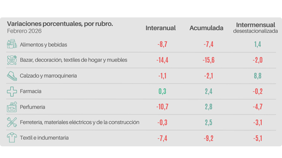 En síntesis, febrero registró una mejora mensual del 2,6%, influenciada por el inicio del ciclo lectivo, sin lograr revertir la caída acumulada del 5,2%. El consumo se concentró en bienes de subsistencia y artículos escolares por la reasignación del gasto de los hogares.